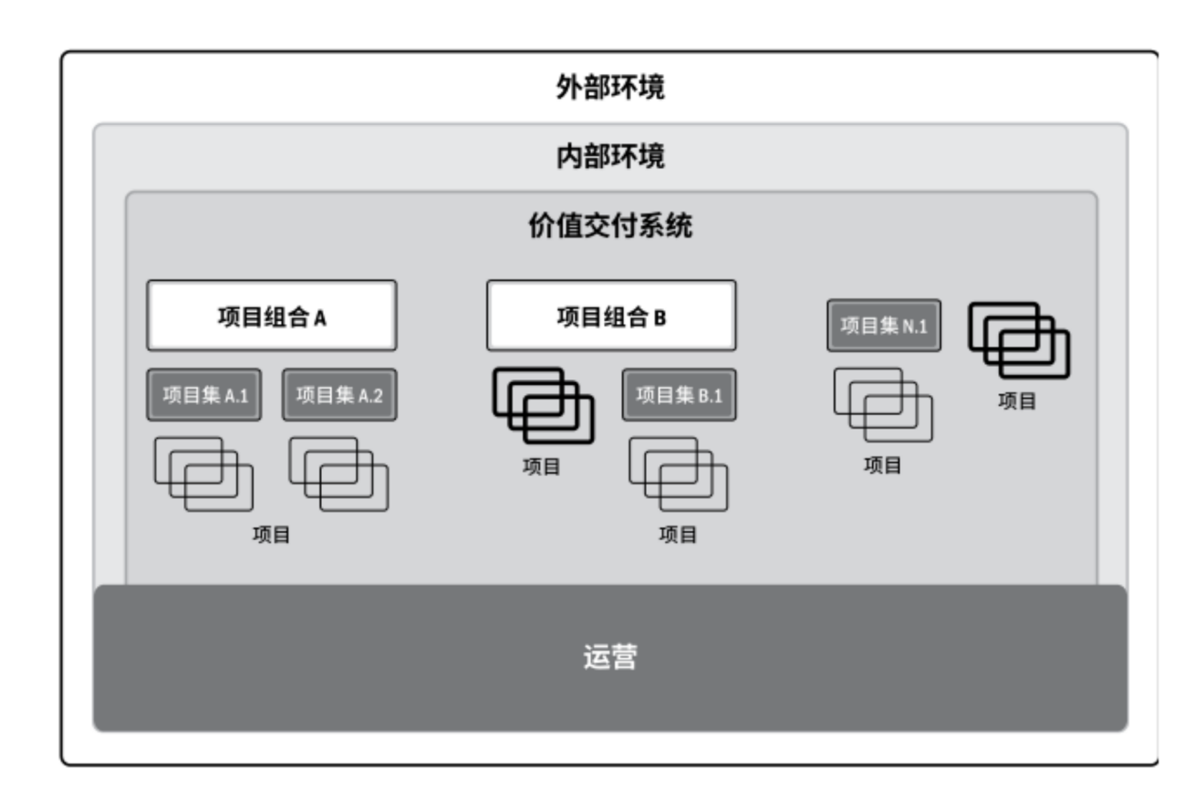 从图中可以看到,一个个项目单元组成了项目集,不同的项目集和项目组成了项目组合,项目组合A、项目组合B和其他的项目再加上运营,组成了整个价值交付系统。
