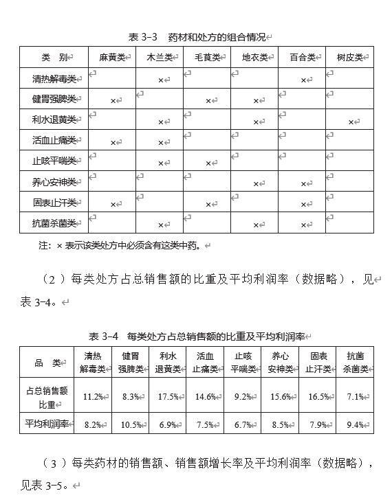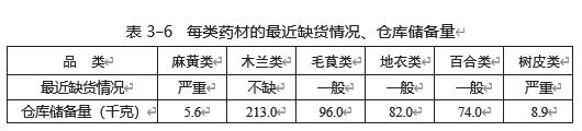 (4 )每类药材的最近缺货情况、仓库储备量(数据略),见表 3-6。