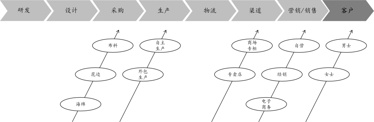 模板使用要点:(1)绘制公司目前在价值链中占据的所有位置,例如研发、设计、生产等;(2)在可能的情况下,绘制二级价值链。
