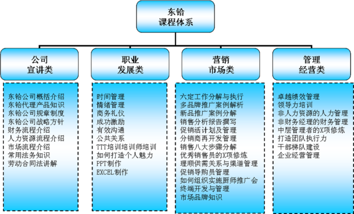 下面以笔者曾经服务过的一家公司,东铪商贸有限公司的培训课程体系为例,如图3-4所示。
