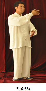 右云手:腰微含,向右外转,右脚以脚跟为轴,往右外转脚尖。左脚以脚尖为轴,往左外转脚跟。身体随腰右转面朝向西南方向; 腰向后拱,重心落于左腿,呈下倚坐式。右手随腰后拱,右下划弧摆至右侧胯旁。左手下划弧落于左腿侧旁;腰上提走弧形,左掌随腰向上走弧形,向右前穿掌,重心落于右腿上;腰微提,左脚跟随提起,向左顺开一步,掌心向右,上身微俯。腰上提身体直立,左掌抽回胸前高与乳平,掌心向里。右手弧形拉回至腹前,掌心向里。左手在上,右手在下,两臂圆撑,脊背后倚 (见图6-535至6-539)。