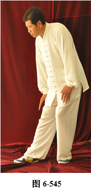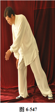 左云手:接上式,腰微拱,向左旋转。左脚以脚跟为轴向外转脚尖,脚尖转向东南。右脚以脚跟为轴向里转脚尖,脚尖转向东南。身体转向面朝东南;腰随即后拱,呈后倚坐式,重心落于右腿。左手随身转下摆至左胯侧旁,右手随拱腰下摆落于右腿侧旁,上身微俯;腰上提走弧形,右手经腹前向左前下穿掌,掌心向左,随穿掌重心移于左腿(见图6-540至6-543)。腰上提身体直立,右脚随身体直立向左脚并拢。右掌抽回胸前高与乳平,掌心向里。左手弧形回至腹前,掌心向里。右手在上,左手在下,两臂圆撑,脊背后倚。