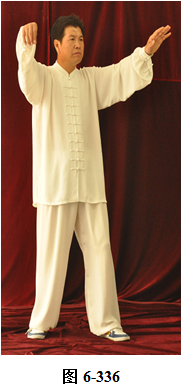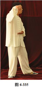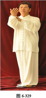 接上式,腰上提往左旋转,身体随向左转动,眼神也同时随之向左看。挤式不变,跟随身体也向左转至正南,向上方插掌,右脚随之内转,脚尖朝向正南;腰微拱,插掌的两臂顺势向下採,重心落至右腿,呈微倚式;腰向右外旋传,面侧向西北。两臂随之翻转向右后,左手掌脱离右手腕,两掌指尖斜指向地面,两掌心朝下; 左腰上提,左脚提起,向左外开,脚尖朝向正南,与左肩垂直平行。右腰同时上提向左转,两臂随向左划大平弧,摆向正南,呈左弓步; 腰随之后拱向左外撑,重心移至右腿,两臂继续划圆,随重心转移后坐,收之腹前。左手里旋翻,手心朝上,两掌心相对合在一起(见图6-329至6-336)。腰微拱旋转向右,两掌相合的右肘也随之微转, 稍斜向西北,打出右边肘;腰回转微含,随之上提,右臂顺势向右外打开,右掌变勾手,向右上方平送,略高于右肩,左手仍置胸前; 腰微拱向左外转,提左膝,左脚向左前上方迈出一大步,脚尖朝向东南。 身体随转面向东南,右脚随之内转。左腰继续上提,左臂随之掤出,成左弓步。腰微拱,身体稍后倚 将掤出左掌顺势内旋翻,掌心向下採按至腹前。腰随即上提,左掌顺势向左前上方推出。