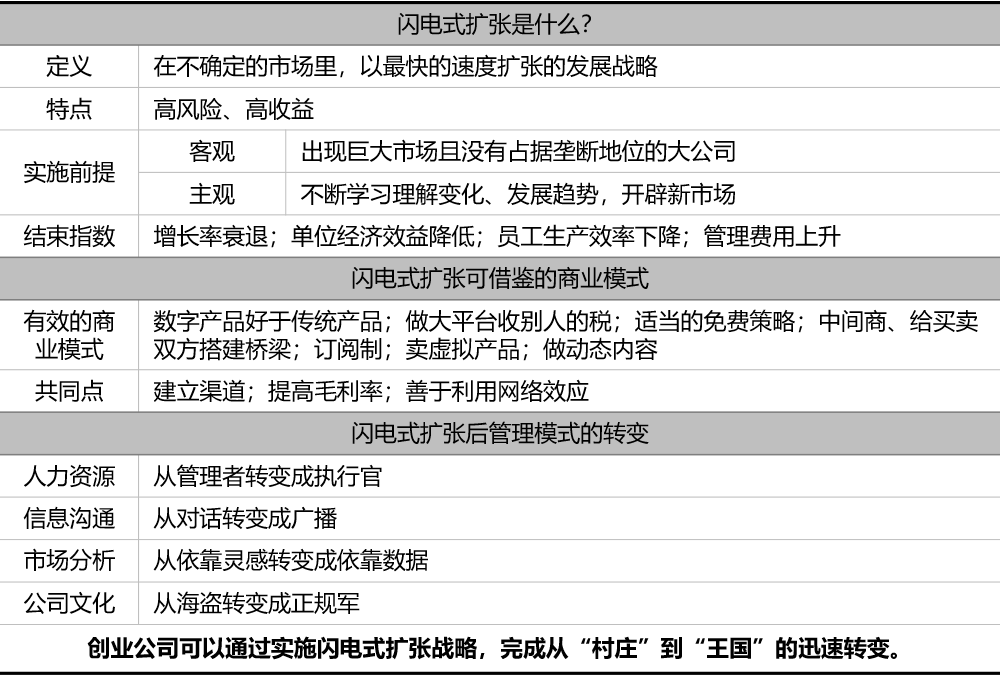 2010年秋天,中国深圳,腾讯总部。 马化腾正在思考腾讯的下一步发展。他在1998年与深圳大学的4位同学共同创建了这家公司并经营至今。凭借其核心产品—月活跃用户达到6.5亿人的QQ,腾讯已成为中国最有价值的互联网公司之一,收入近20亿美元,市值超过330亿美元,员工超过10000人。然而,QQ是一款基于20世纪90年代后期技术的成熟桌面端产品,其用户群已停止增长。它的美国同类产品AOL Instant Messenger已呈现出迅速下滑趋势。 马化腾确信,腾讯必须为新兴的智能手机平台,者其他平台开发新的突破性产品。“能应对变化的互联网公司将生存下来,”他说,“做不到则会灭亡。” 那天晚上马化腾看到的消息来自一名腾讯员工——张小龙。张小龙也曾是一名企业家,5年前腾讯收购了他的公司Foxmail。张小龙当时负责腾讯的广州研发部门,那里距离腾讯深圳总部只有两小时车程。他一直关注一种叫Kik的新型社交通信产品的快速增长,它在年轻人中特别受欢迎。他认为,腾讯需要为智能手机打造自己的社交通信软件,而且要快。 张小龙的建议不仅代表着巨大机遇,还代表着巨大风险,同时其结果也存在巨大的不确定性。虽然新的通信软件可能会吸引年轻消费者,但它也可能对QQ形成冲击,毕竟后者是腾讯的核心业务。此外,腾讯已经与中国移动等主要移动运营商合作,收取QQ用户向手机发送短信产生的短信费用的40%。新服务可能损害腾讯的财务收益,还会威胁其与部分中国巨头公司的关系。 有数万员工的上市公司通常会将这种决策提交给某个委员会进一步研究。但马化腾并不是传统的公司高管,那天晚上,他让张小龙继续跟进这个想法。张小龙组建了一个10人团队(包括7名工程师),负责开发并推出新产品。 短短两个月内,张小龙的小团队就开发出一个移动端优先的社交通信网络,其设计简洁,与QQ截然不同。马化腾将这种服务命名为微信,意即“微信息”。在中国之外,这项服务被称为WeChat。 接下来发生的事令人惊叹,在张小龙于深夜向马化腾发出这条重要信息的短短16个月后,微信迎来了第1亿位用户。又过了6个月,它的用户数量已增长到2亿。再过了4个月,它的用户数量增长到3亿。 马化腾的深夜决策得到了丰厚回报。2016年,腾讯的账面收入为220亿美元,比上一年度增长48%,比2010年(微信推出的前一年)增长近700%。2019年年底,腾讯的市值超过3.58万亿港元,成为全球最有价值的公司之一,微信也成为世界上使用最广泛、最频繁的服务之一。美国最具影响力的商业杂志之一《快公司》称微信为“中国的万能应用程序”。据《金融时报》报道,超过一半的微信用户每天使用微信的时间超过90分钟。 腾讯、阿里巴巴、小米、Airbnb、Facebook、苹果、亚马逊……这些公司有什么共同秘诀?目前所有分析里,有归结于创新技术,或是人才,或是资本和企业文化。里德·霍夫曼在与数百家全球最有价值的企业,如腾讯、脸书、谷歌、网飞、Dropbox(多宝箱)、推特和爱彼迎的创始人深入交流后发现,尽管这些公司的发家故事在很多方面都截然不同,但它们都采用了一种极端、笨拙、冒险、低效、破釜沉舟的增长方式——闪电式扩张。 闪电式扩张,源于20世纪用“闪电战”来描述的一种以迅雷不及掩耳之势全力出击的方法。最初是用来形容第二次世界大战期间海因茨·威廉·古德里安将军为纳粹德国最初的军事行动设计的“blitzkrieg”(闪电战)战略。时间就是金钱的如今,企业的成长已不仅限于传统的步步为营,要想让企业在变幻无常的市场下短期内快速崛起,很有必要了解闪电式扩张战略。 应用于商业领域,闪电式扩张是一种策略和一套方法,用于推动和管理在不确定环境中优先考虑速度而非效率的极快速增长。换言之,它是一种加速剂,可以让你的公司疯狂增长,从竞争的泥潭中解脱出来。 闪电式扩张需要超高速增长,但不只是“快速做大”的浅陋策略,因为它需要有目的、有意识地去做传统商业思维认为没有意义的事。在闪电式扩张时代,公司领导人必须做出一个艰难决定:承担对公司进行闪电式扩张带来的额外风险和不安;或者保持现状,但若竞争对手抢先进行闪电式扩张,则可能面临更大的失败风险。 《闪电式扩张》一书的前身是斯坦福商学院的一门课程,由领英创始人、风险投资家与作家里德•霍夫曼主讲。霍夫曼把课程浓缩成这本书,从商业模式、战略和管理三个角度提出了具体的创新方法,并分享了快速打造一家市场领先公司的关键秘诀。如表5-4所示。 表5-4 闪电式扩张