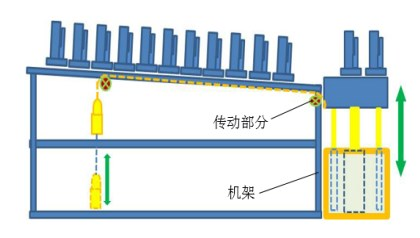 此装置运用一套链轮,搭配右侧的黄色配重装置。当物料加工完成后,该装置能使物料从顶端缓慢落下,同时配重块逐渐上升,通过动力平衡实现物体的上下移动过程。在工厂中应用这种装置,能够减轻作业人员上下搬动物料的体力劳动。