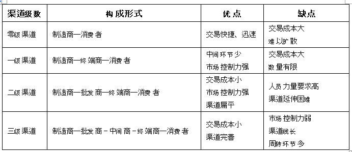 一般的工业消费品多采用零级渠道和一级渠道模式,如果制造商直接设立分销机构如办事处或者通过业务代表实现销售,渠道结构一般不超过两级,一般的快消品如饮料、食品等多采用两级和三级渠道模式。