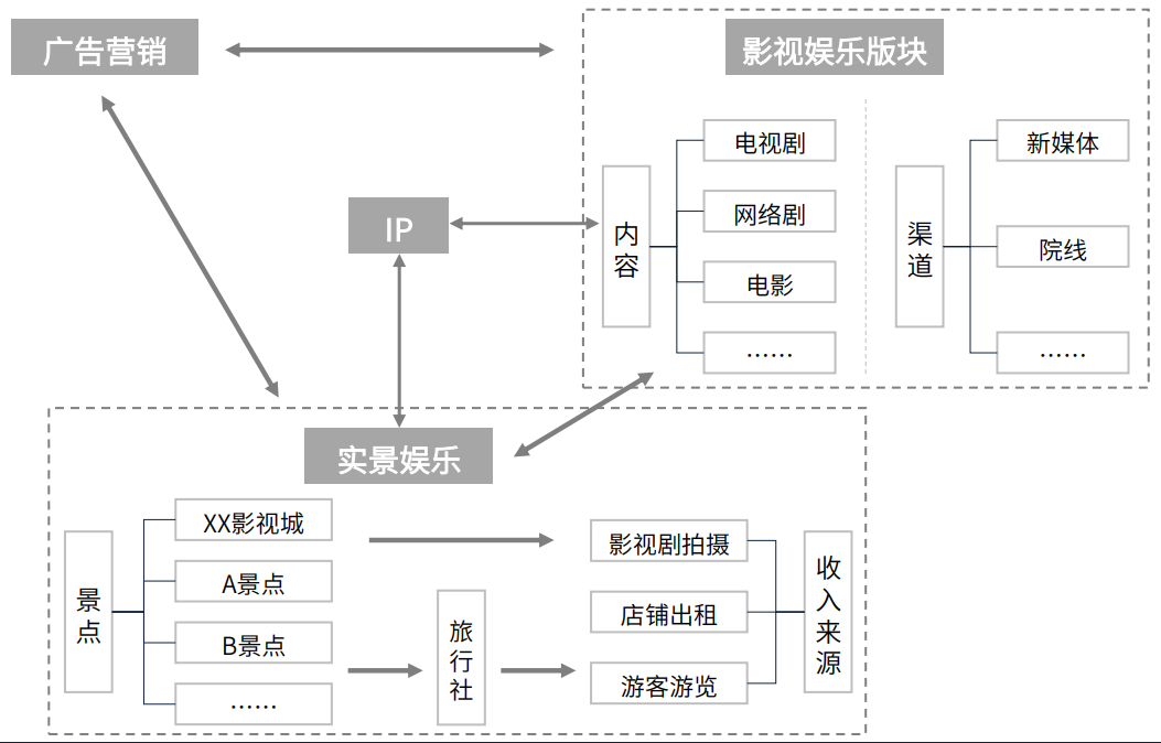 总的来看,B公司进行的一系列并购活动,目的是形成“影视+广告+实景娱乐”的战略布局,公司围绕影视主业同时联动发展广告营销板块和实景娱乐板块进行转型升级。其中,实景娱乐包括景点、旅行社等,影视娱乐包括内容和渠道,三大业务板块之间相互赋能,公司通过IP等打造影视内容,影视可在旗下的影视城等景点拍摄,旗下的广告公司同时为影视和景点打广告,此外热门IP还可赋能实景娱乐,为景点和旅行社引入客户流量。如图8-39所示。