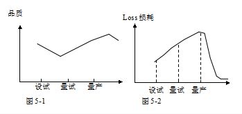 在企划完成后,进入实际的设计开发阶段,而设计开发的时间因产品种类不同而长短不一。例如:飞机设计需要10年左右,汽车需要3年左右,复印机、打印机需要1~2年左右,电脑的芯片需要18个月左右,电脑整机需要数个月,电动玩具一般半年以内,服装2个月左右等等。工业产品从设计开发到大批量生产,一般至少有设计试作、试量产(以下简称量试)以及大批量生产(以下简称量产)。对于复杂的工业产品,例如汽车还要追加技术试作等等几个阶段。一般工业产品从设计试作,到量试,再到量产阶段,其品质水准如图5-1所示,不良率是逐步降低的。其损耗如图5-2所示,设计试作的损耗率很高,但因生产数量极少,总损耗不是太大。在试生产开始,产品数量增多,虽然就单独一个产品来说损耗要比设计试作时少,但总量却比设计试作要高。到大批量生产时,每天成百上千台的生产,而批量生产初期一般品质不太稳定,此时,因品质问题停线及改造产品等等一旦发生,其损失将是巨大的。因批量生产初期生产量远远大于试作时的量,此时暴露问题机会多,同时对策也多,改善也多,所以,绝大多数企业在量产初期较短时间,损耗就很快降下来。近几年在世界知名企业,尤其是电子、电器行业,纷纷提出低损耗、缩短开发周期实现快速推向市场的设计开发概念。