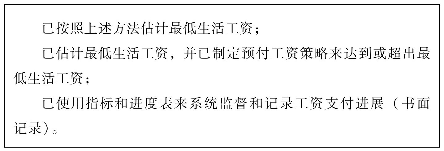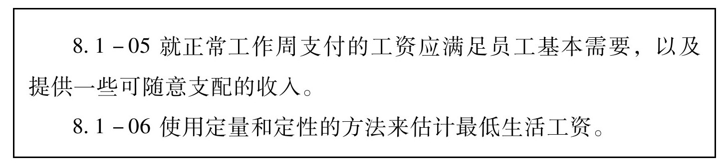答:生活工资定义:工人收到的标准工作周的薪酬应使工人和她/他的家人在其所在地区足以支付中等生活标准。中等生活标准的组成包括食物、水、住房、教育、医疗、交通、服装等基本需求,包括留出资金以备应对突发事件。