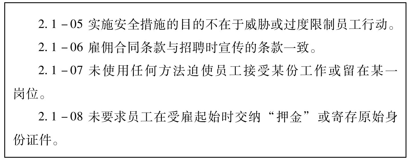 4.本标准目的在于提供一个基于联合国人权宣言,国际劳工组织(ILO)和其他国际人权惯例,劳动定额标准以及国家法律的标准,授权并保护所有在公司控制和影响范围内的生产或服务人员,包括公司自己及其供应商、分包商、分包方雇用的员工和家庭工人。