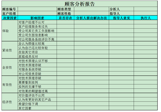 渠道与终端一体化。销售的本质是信任,除了首先建立顾客对销售人员的信任,还需要建立顾客对产品和服务的信任,通常可以分解为五个要素:体验、迫切性、安全性、有效性和经济性。对于产品+服务的项目,体验是非常重要的,能够精致地从体验导入,引导顾客消费,可以获得营销的巨大成功,这就是体验营销的魅力。如果项目无法在售前让顾客体验产品和服务,则需要让顾客体验到服务系统的严谨、专业和关爱。如果顾客没有迫切性,就不可能实现销售,因此销售过程要不断激发和判断顾客需求的迫切性。销售人员必须善于发现顾客的隐性需求,并帮助顾客将需求提炼成问题。如何提炼问题呢?所谓问题就是冲突,也就是建立当下与未来的冲突,那么,要解决冲突,就必须改变现状,形成购买产品和服务的迫切性。与产品和服务相关的因素就是安全性、有效性和经济性。作为渠道,需要帮助和指导终端在这五个方面进行铺垫,必要时借助厂家平台的力量实现销售。下表是某医美企业的顾客分析指导工具: