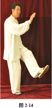(2)左式踩腿:左式与右式动作相同。唯踩时左手做引拿动作,右掌向前伸,撩闪人的面部;左脚掌心同时向前下踩,右膝弯曲350,重心落于右腿,眼神目视前方(见图2-14)。