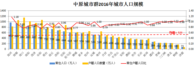 从人口总量看,中原城市群常住户籍比为0.91,属于人口流出城市群,2016年人口流出近1601万人。常住户籍人口比≥ 100%以上的城市有6个,分别是:郑州、济源、长治、晋城、运城、淮北。