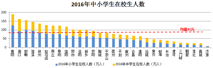 从小学生2016年在校生人数看,中原城市群2016年小学生在校人数为1555万人,占全国小学生在校人数9913万人的15.7%,高于城市群占全国总人口比重11.84%的水平;中原城市群30个城市小学生在校生人数总涨幅为-5%; 重点关注城市郑州、菏泽、邢台、阜阳。