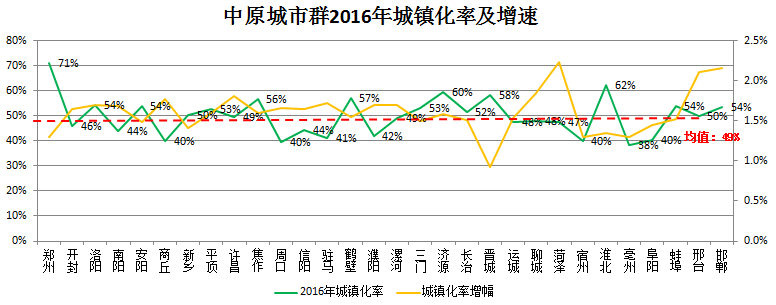 中原城市群30个城市城镇化率在城市群城镇率均值49%以上的城市共17个,分别是郑州、洛阳、安阳、新乡、平顶山、许昌、焦作、鹤壁、漯河、三门峡、济源、长治、晋城、淮北、蚌埠、邢台、邯郸。30个城市2016年城镇化率增幅在0.9%—2.2%之间,平均城镇化率增幅为1.6%。晋城城镇化率增幅仅为0.9%,郑州因城镇化率水平较高,增幅缓慢,增幅为1.3%。