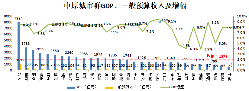 30个城市中GDP超过均值1878亿元的共有13个,其中超过3000亿的城市有3个,为郑州、邯郸、鹤壁。城市群一般预算收入的均值为132亿元,高于均值的城市共有11个,分别为郑州、邯郸、鹤壁、宿州、南阳、阜阳、许昌、淮北、济源、三门峡、运城。