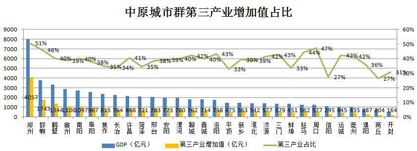 中原城市群整体第三产业增加值占GDP比重为39%,低于全国51.6%的平均水平; 从产业发展潜力看,30个城市中,只有郑州第三产业增加值超过50%,其余城市均低于50%。城市第三产业占GDP比重>城市群整体占比39%的有17个,为郑州、洛阳、邯郸、南阳、聊城、安阳、许昌、新乡、晋城、驻马店、运城、周口、三门峡、毫州、济源、漯河、鹤壁。