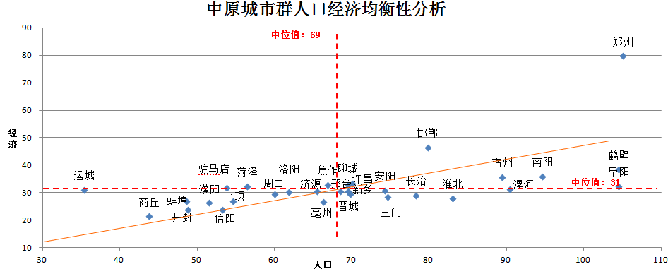 我们对中原城市群各个城市的人口与经济进行了均衡分析。中原城市群人口与经济沿均衡线发展,均衡线以下且偏离越大的城市更应该关注产业发展,其中阜阳、漯河、淮北等城市要重点关注新产业进驻,有可能会带来城市发展的巨变;均衡线以上且偏离越大的城市更应该关注人口政策,其中郑州、邯郸、运城等城市要重点关注人口政策变化带来的人口集聚,有可能会带来人口短时膨胀。
