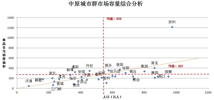 中原城市群城市市场容量基数均值为240万㎡ 。市场容量及安全指数TOP3的城市为:郑州、阜阳、邢台。
