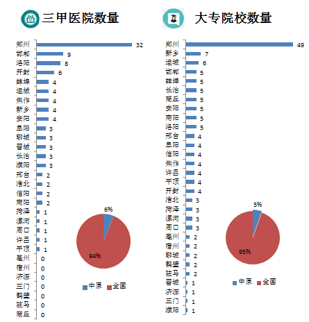 从最直接影响房地产的医疗教育配套来看,中原城市群整体配套相对较好,三甲医院共有103所,占全国三甲医院总数1599所的6.4%; 中原城市群共有大专院校151所,占全国大专院校总数2631所的5.7%。