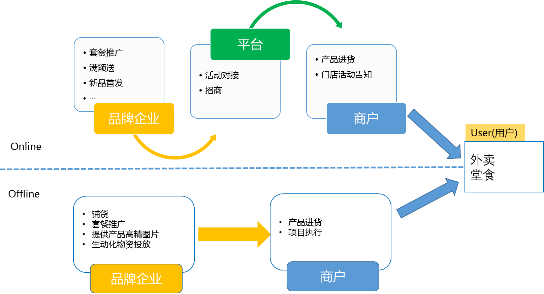 用户以外卖平台为搜索路径,以美食和快餐为窗口的餐饮外卖选择方式,用户通过APP线上搜索、选择餐饮美食,享受外卖服务。商户在线下通过引进品牌品牌企业产品,进行线上线下套餐的推广,消费者既可以在线下堂食体验,又可以线上享受外卖服务的套餐。品牌企业借助商户端产品的引进,获得线上线下不同消费场景的销售。如图12-4所示。