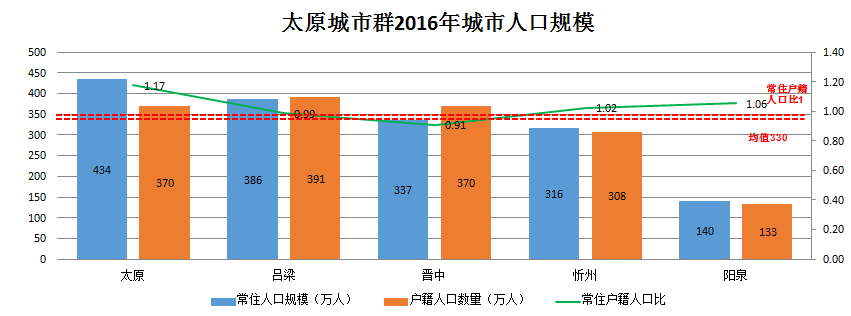 从人口总量看,太原城市群常住户籍比为1.03,属于人口流入城市群,2016年人口流入近41万人。常住户籍人口比≥ 100%以上的城市有3个,分别为 太原、忻州及阳泉;从人口分布看,户籍及常住人口均未有超过500万人的城市。