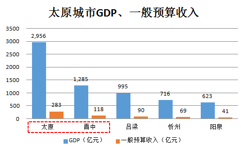 5个城市中GDP超过均值1155亿元的共有2个,为太原及晋中。 城市群一般预算收入的均值为105亿元,高于均值的城市共有2个,分别为太原及晋中。