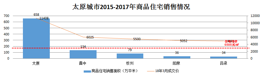 太原城市群5个城市2015-2017年商品住宅市场平均年成交面积为940万㎡;太原住宅成交面积分别为658万㎡,销售面积占整个太原城市群成交总量的70%。