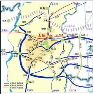 太原城市群将“东融西进、外疏内联”定为综合交通的发展目标。具体包括完善区域通道,重点加强与环渤海的联系,提升太原交通枢纽的地位;加强煤炭运输通道建设;整合客货运枢纽建设;建设重要旅游景点与支线机场、高速公路、干线公路之间的便捷通道,实施“一小时通达”工程。