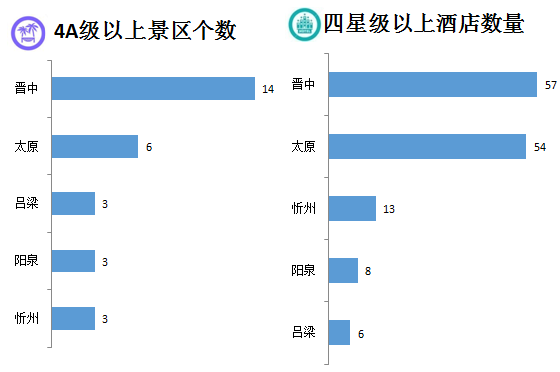 太原城市群共有4A级以上景区29个,占全国4A级以上景区1335个的2.17%。四星级以上酒店138个,其中四星级以上酒店达到50家以上的城市有2个,分别晋中及太原。