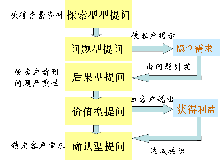 第一,策略性提问的5种模式是一种逻辑过程,通过探索型提问有针对性的获得客户的背景资料,以问题型提问揭示客户的隐含需求,以后果型提问使客户看到问题的严重性,再由价值型提问让客户自己说出获得的利益和好处,最后以确认型提问最终锁定客户的需求。看起来5种模式依次提问是比较理想的情况,实际情况不会这么简单。