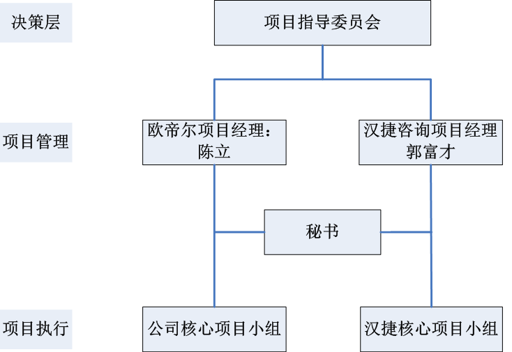 组织管理是变革的保证,为配合欧帝尔公司IPD咨询项目实施,咨询公司和欧帝尔公司分别成立了IPD咨询项目团队,咨询项目组织结构及职责如下: