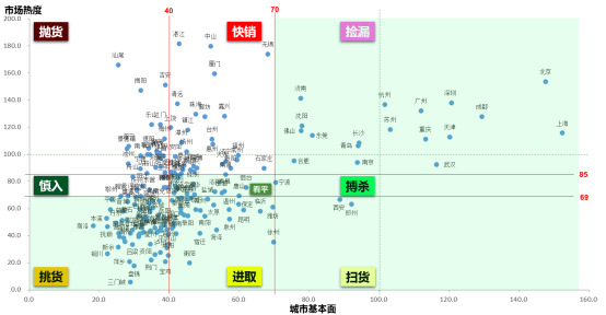 抛货区、快销区、慎入区,建议房地产企业谨慎拓展,未进驻城市,则不进驻,已进驻城市,以出货为主。