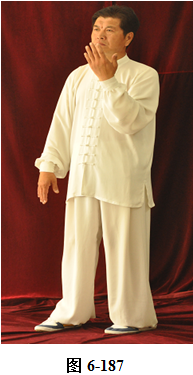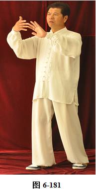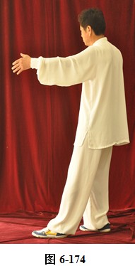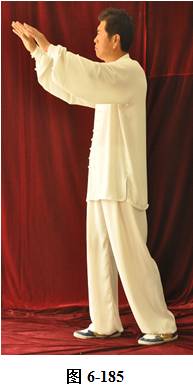 掤:右腰上提,右脚向前迈步,重心渐渐移至中间,成右弓步; 腰继续上提,右小臂同时向右上前方打掤,右掤手高与膻中穴平。左手掌心向下置于左胯旁,意念领腰继续上提,右手随之向右上撩掤,左掌跟随向上,当掤至略高于肩时,两掌翻转掌心斜相对(见图6-174至6-189)。