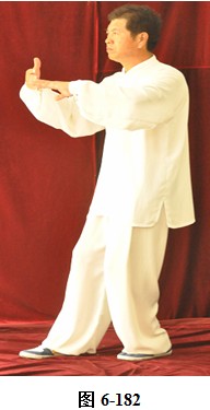 注意:身体左右转动时,要以腰为轴,内劲带动,身体保持中正、松肩、松胯、松膝。这套拳自始至终对身形的要求都是一致的, 动作要柔缓,速度要均匀,手脚的动作配合更要协调一致。弓步时小腿要垂直,膝盖以不超过脚趾与脚掌相连的指节为宜。