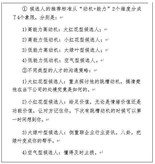 其次,针对不同类型的候选人也总结了一 些推荐策略和沟通策 略,供大家参考