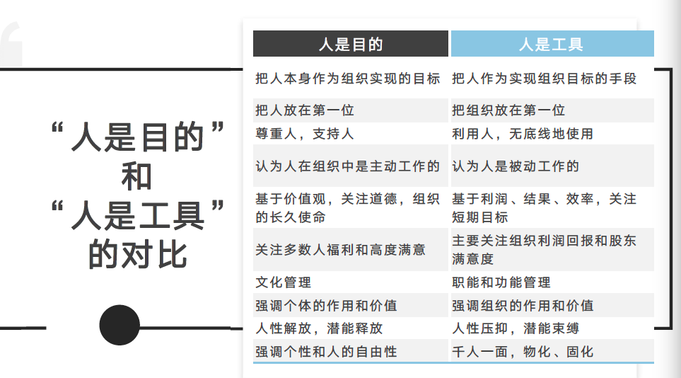 人是目的,是把人本身作为组织实现的目标;人是工具,则人是依附于组织的。这是人与组织关系上的一个根本性的变化。由此,人与组织的关系就有了新面貌、新特点,人力资源的发展阶段也进入第四阶段,即“人是目的”的阶段。