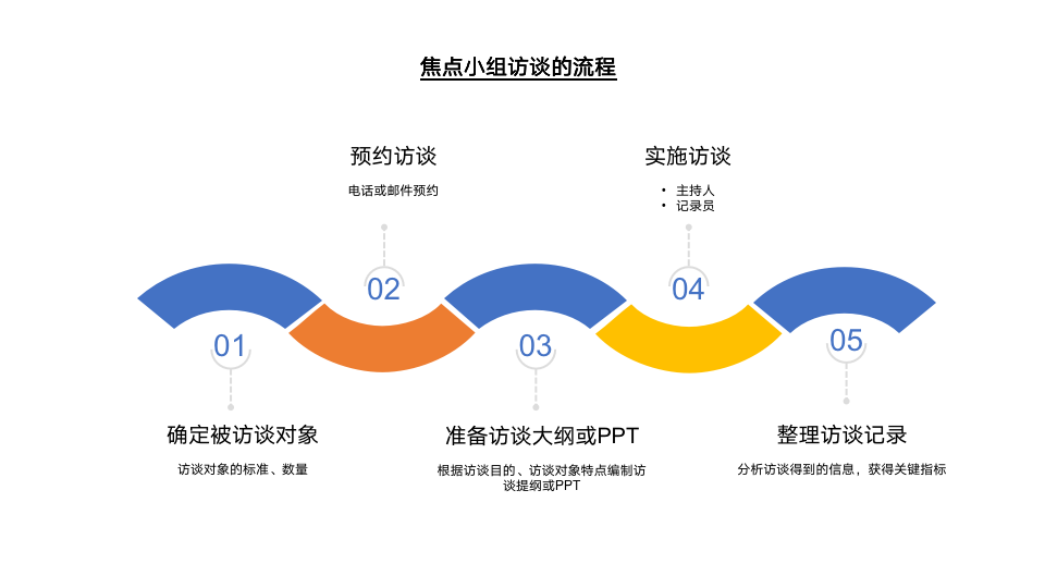 虽然焦点小组访谈的效率比行为事件访谈效率高,但需要大量的组织工作,这也是焦点小组访谈能够成功的关键。具体来说,焦点小组访谈的组织流程主要流程有五步,如图5-3所示。