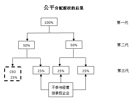 在“原生家庭”的“公平”模式影响下,许多私营企业的企业主在做股权分配时,往往为了避免被指责对下一代不公平,大多不管下一代子女是否有参与企业的经营意愿,都选择传统的所谓“公平”的方式处理——由子女平分股权。但是要考虑这种分配方式是否“公正”,尤其是对那些积极、勤奋参与企业经营的子女是否“公正”。
