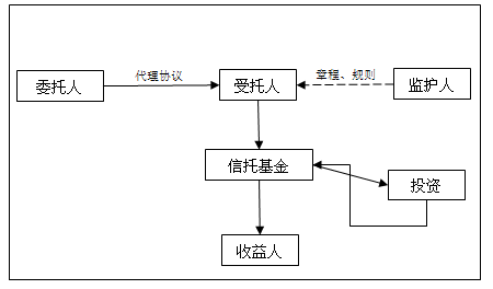 “家族财产管理信托基金”的做法可参考下列(图5-3)信托基金结构模式。由此模式中可知委托人将其资产交予受托人管理,成立信托基金,委托人与受托人之间签订委托信、意向书和代理协议;而受托人与监护人之间订立章程、规则,以确保收益人的权益。