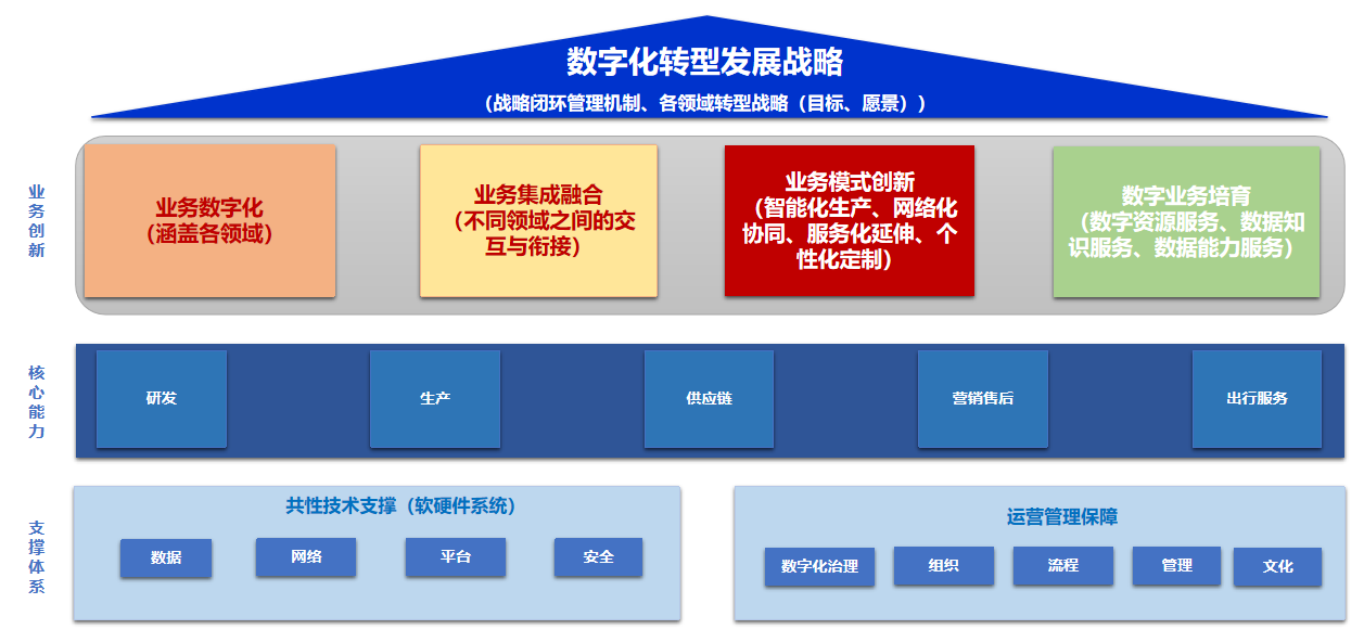 第三,核心能力的升级是汽车企业战略目标达成和业务创新实现的必要条件,包括研发、生产、供应链、营销售后和出行服务等。核心能力的建设与升级,对共性技术支撑与运营管理保障提出需求,进而获得技术上的支持与管理上的支持,确保核心能力的数字化转型得到保障。