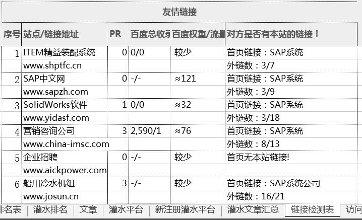 注解:该表用于检查与企业网站做友情链接的其他网站是否反链到本企业网站上,并且对方的网站是否运行正常,SEO指标是否正常。该表每周记录一次,对于异常现象(没有反链到本站,网站打不开,SEO参数突然下降),要及时发现并暂时断开友链。