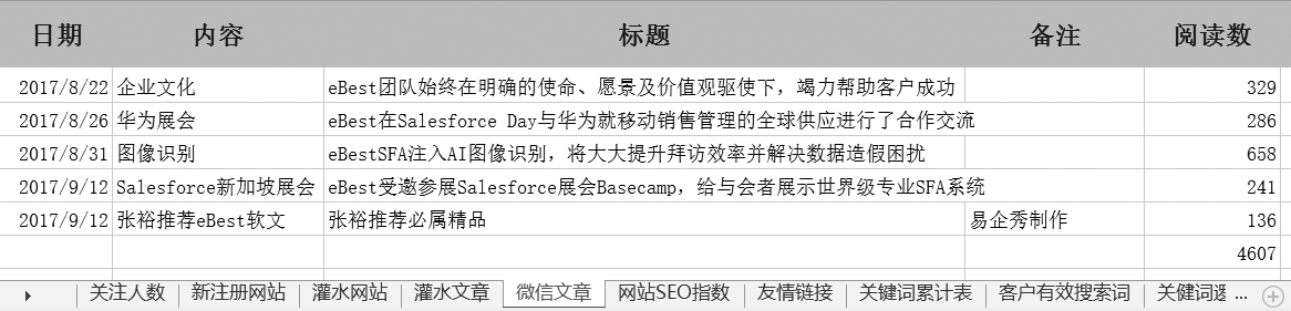 这是我们日常工作中的常见报表,也可以根据客户的不同需求进行调整,如有的客户需要将大量的文献放在百度文库,或者是增加微信公众平台的工作量和成绩监控。如表7-14所示,一家销售软件公司增加的微信营销报表。