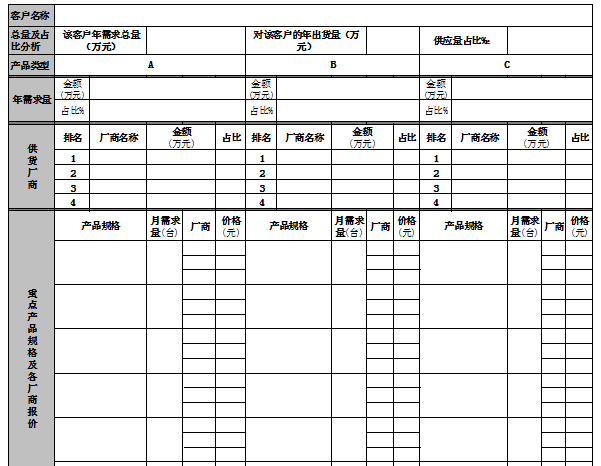 主要包含三个数据,该客户上一年度采购该品类的总金额,公司对该客户的出货金额,对比得出第一个关键性数据,即对该客户的份额占比,此数值代表公司在该客户供应商中的定位,采购量是一个直接的体现数据。一般情况下,此数值超过80%,代表着已经成为该客户的战略供应商。
