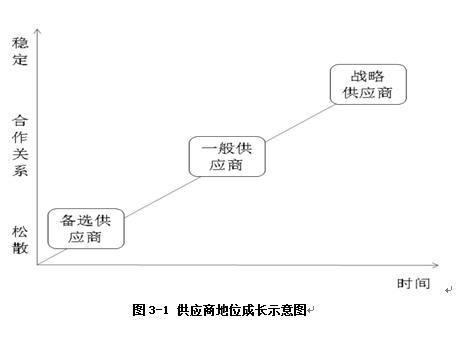 首先,厂家通过少量订单来维系双方的合作关系,一旦战略供应商出现例外情况不能满足订单需求时,可以立即有合格供应商替代,不影响正常的经营。其次,有多个供应商存在,也体现一种竞争状态,有助于厂家把控供应商和平衡与供应商关系。一旦有合适的机会,如战略供应商出现产品质量问题或服务问题、双方人员出现变动、供应商经营方向转移等情况出现,一般供应商就有可能成为战略供应商。如图3-1所示,供应商地位成长过程。
