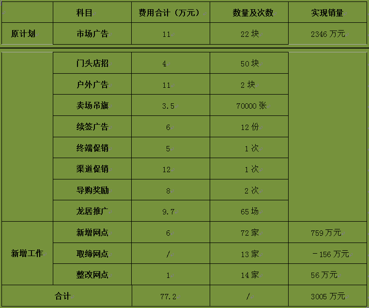 原计划投入的77.2万元将重新进行分配,按照计划调整的三原则:总销售目标不变,仍是4334万元,下半年实际销售任务2655+186=2841万元。由于销售未达标属于区域的个别现象,故需要在确保持续提升知名度的基础上(确保广告投放费用),适当降低终端促销费用与龙居场次的考核,通过开发和整改网点直接提升销量的方法,弥补可能形成的销售缺口496万元(该区域上半年度未达到企业销售目标,已经形成了销售缺口186万元。按上月销售额3%的市场费用支出,共支出费用58万元。下半年按88.34%的完成率计算的话,仍将产生310万元的缺口,两者合计形成496万元的销售缺口),具体如表5-3所示。