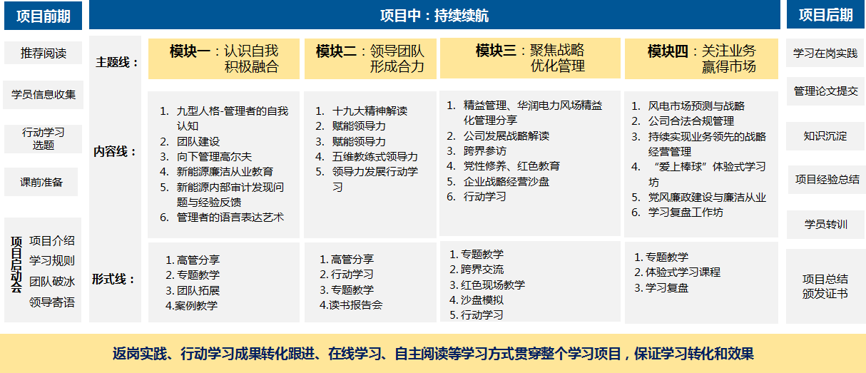 主题就是模块的主题内容,好的主题能够起到提纲挈领的作用。我在做一个中层管理干部培养项目的时候,把项目分成四个模块,对应的有四个主题,分别是“认识自我、积极融合”“领导团队、形成合力”“聚焦战略、优化管理”“关注业务、赢得市场”。