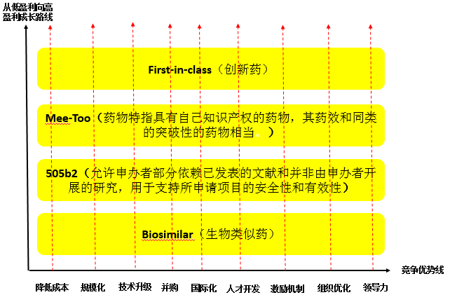 如图2-5所示,有志于从仿制药向创新药发展的企业或者想从低盈利仿制药企业向高盈利仿制药企业发展的药企,都可以从简单技术向复杂技术、从纯仿制到仿创结合发展。比如可以从普通仿制药向生物类似药(Biosimilar)发展,继而向允许申办者部分依赖已发表的文献和并非由申办者开展的研究,用于支持所申请项目的安全性和有效性(505b2)拓展,再进一步向药物特指具有自己知识产权的药物,其药效和同类的突破性的药物相当(Me-too)发展,直到开发完全创新药(First-in-class)。