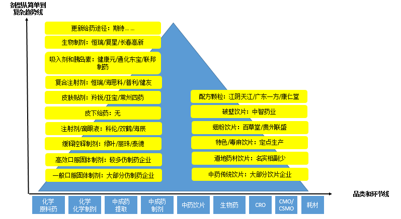 图2-6勾画了当下中国仿制药企业从普通口服固体制剂到更复杂剂型的路线图,从图中可以看出,中国目前绝大部分药企的剂型都是口服固体制剂,竞争门槛非常低,技术含量不高。一些有远见的药企通过向复杂剂型挺进逐步拉开与低竞争力药企的距离,有条件的药企要积累资源向上拓展。