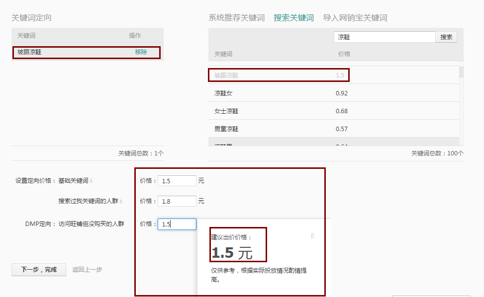 接下来,依据系统关键词或者搜索关键词进行基础关键词、搜索过我关键词人群、dmp定向。访问店铺但没购买的人群的价格设置(系统会给你参考价),如要加价可以在其推荐价格上稍微加上0.1元,千万不别盲目乱加或者像土豪一样加,掌握了技巧之后稍微能好点,没掌握技巧如果乱写会浪费钱,如图11-17所示。